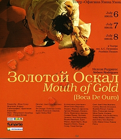 Марина Тимашева: Так Жозе Селсу говорил, а потом показывал на сцене Театра имени Пушкина то, что, скорее, можно назвать зрелищем, чем спектаклем. Называется оно "Золотой Оскал". Это современная пьеса о бразильском мафиози, который заменил все здоровые зубы на золотые, и оттого получил прозвище "золотой Оскал". Действие начинается на театральном балконе.