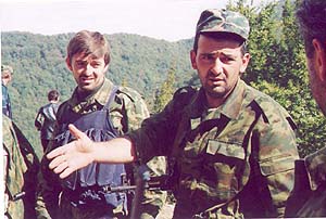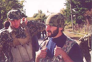 Военный конфликт в Абхазии начался в конце сентября накануне мандаринового сезона с захвата пришлыми боевиками сел Георгиевское и Наа, где были убиты несколько мирных жителей. Позже выстрелом из портативной зенитной ракеты был сбит вертолет с миссией военных наблюдателей. Погибли шесть сотрудников ООН и три члена экипажа. С этого момента конфликт в Кодорском ущелье приобрел видимые черты и вылез на экраны мировых телекомпаний. В Сухуми началась мобилизация резервистов, и тысячи ополченцев двинулись в горы защищать свою республику от непрошеных гостей. Людей Руслана Гелаева удалось остановить в сорока километрах от столицы у горы Сахарная Голова. Здесь часть боевиков попала в окружение. Армянское село Наа, всего около сотни дворов, раскинутых на правом берегу Кодоры, превратилось в укрепленный форпост: снайперы на крышах домов, оборонительные сооружения из мешков с песком и группы ополченцев, окопавшиеся в садах и огородах сельской окраины. Боевого опыта абхазам не занимать. Но на войне трагическое и смешное всегда рядом. По словам майора милиции Отара Бгамба, отдельные сцены в Наа напоминали эпизоды из грузинских кинокомедий. Отар Бгамба: У них - разрозненные группы, кушать хотят. Мы выдели вчера и позавчера, с этой сопки спускались, где кукуруза, и начали за курами бегать. Там такие заросли, видимо, они изучили уже места, сразу прятались. Хотели поговорить с ними, я думаю, что если предложение дадим им сдаться, они сдадутся. Голодные, холодные - кому приятно в лесу прятаться? Мумин Шакиров: Какова была ваша реакция? - Реакция - начали стрелять в них. Мумин Шакиров: Отчаявшиеся от голода бойцы Руслана Гелаева, смертельно рискуя жизнью, нередко переодевались в гражданскую одежду и в поисках пищи спускались в село. Но бдительные местные жители всегда были начеку и активно помогали военным. Один из таких инцидентов произошел среди бела дня в том же Наа. Подозрительного человека обнаружила у себя во дворе пенсионерка Валентина Кагриманян. Валентина Кагриманян: Я была дома одна и смотрю - по ступенькам кто-то поднимается. Я обычно знаю, что солдаты здесь ходят в военной форме, а то - в простом, и в окна смотрит. Когда он обернулся в мою сторону, я вышла, как будто я его не заметила, и всем прибежала, сообщила - не знаю, кто там, может быть, это разведывательная их группа, или кто. Такой здоровый, с автоматом в руках. Все страшно, малейший шорох, малейшее что-нибудь - валерьянку пьешь. Пусть моя соседка, у нее спим мы ночью, боимся домой приходить. Этого никто, наверное, не знает, не понимает. Мы две войны пережили за десять лет, это вы не знаете, что это такое. Почему все дружно не будем жить, ну почему? Грузинам здесь что не хватало? Почему они так делают? Они же жили, они самые главные посты занимали, грузины. Не абхазцы были на главных постах, а они были. Что им не хватало, что они войной пошли сюда? Мумин Шакиров: На этот раз непрошеный гость сумел скрыться, хотя пару дней назад резервисты взяли в плен двух человек - чеченца и кабардинца, прямо во время трапезы в одном из заброшенных домов. Не имея поддержки среди населения, трудно рассчитывать на успешное ведение партизанской войны - это один из главных просчетов организаторов силовой акции в горах Кодора. А тут еще капризная осень в горах, постоянные дожди, плотные туманы и ранний снег. В этих условия