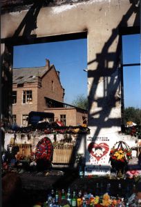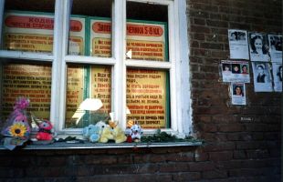 Ляна: Они с братом раньше пошли, а я с мамой позже пошла. Потом мы в спортзале встретились. Мы посередине с мамой, а брат совсем на углу. Елена Фанайлова: То есть вы и разговаривать-то не могли? Ляна: Нас мама не пускала. Стреляли, но я не боялась. У меня вот здесь перелом и осколок. Елена Фанайлова: Это кисть. Ляночка, ты показываешь на кисть. Ляна: Наверное, это палец. Или вот здесь, рядом болит. Вот здесь перелом, а здесь осколок. Перевязку делали. Палец болит только. Елена Фанайлова: Рука правая - неудобно одеваться, умываться? Ляна: Я почти уже левша. (Смеется) Елена Фанайлова: Ты левой рукой пишешь? Ляна: Да, уже начала. (Смеется) Елена Фанайлова: "Город ангелов" - так кто-то недавно назвал Беслан. Наверное, так смеются раненые ангелы, когда собираются выздоравливать: Звучит песня осетинского рэпера Денислана Дудова: - Посвящается всем пострадавшим и погибшим в результате захвата школы города Беслана, Северная Осетия. Мы скорбим вместе с вами. Сентябрь. Осетия. Солнечный день. Елена Фанайлова: Голый кирпичный закопченный каркас, выбитые стекла, крыша покорежена взрывом... Бесланская школа номер 1 на глазах людей стала мемориалом скорби. Горожане ходят сюда каждый день. Школа обложена по периметру живыми цветами, сгоревший пол спортзала выложен венками. На стене - распятие. Все это кажется моментальной фотографией ада. Олег Кусов: Рассказывает бывший заложник Аслан Тебиев. Аслан Тебиев: Кто ругался, кто держался: В основном, старшее поколение, женщины - они уже морально не выносили. Душно было, воды не было. Люди как бы полусонные были. Уже даже не понимали, что делают. Они говорили сперва: "Выпустим", потом сказали: "Молитесь. Кто попадет в ад, кто - в рай. Пока у нас оружие есть, будем отбиваться, а потом все умрем". У детей, во-первых, шок был. Многие уже как бы с ума сходили, не понимали, что делали. Многие теряли сознание - их даже выносили. Вот ребенок уже мертвый - запрещали вынести. А детей их даже не слушали, они кричали, орали, плакали. С кем война? С детьми? Ничтожества! Да они даже не фанатики, это как роботы были. Их подготовили к этому, кому-то это нужно было. Три дня без сна, они как нелюди ходили, их даже на сон не тянуло. Олег Кусов: Третьеклассник Ацамаз Доев 1 сентября пришел в школу вместе с братом, первоклассником Давидом, и мамой Фатимой. Все три дня они просидели в спортзале рядом. Ацамаз сказал мне, что в такой ситуации он не имел права умирать, поскольку считал себя ответственным за жизнь близких людей. Ацамаз Доев: Особенно за брата. Олег Кусов: Но он же тоже мужчина. Ацамаз Доев: Ну, он младший, сильней боялся. От мамы никуда не уходил. Даже если в туалет хотел, я не шел - маму не оставлял. Олег Кусов: У его мамы, Фатимы, напротив, не было никакой уверенности в том, что она и ее дети выйдут из школы живыми. Но Фатиме посчастливилось остаться в живых, хотя она и получила осколочное ранение в ногу. Фатима: Все время они кнопки какие-то переключали. Я думала: если даже уйдут, то все равно это все подзорвут. Но почему-то у них другое отношение было на третий день, уже во время штурма, - сами нас водой поили, ведрами давали: "Только не бойтесь, мы вас не убьем". Это уже было в столовой, там откуда-то печенья было две коробки, большие пластмассовые из-под пива чашки, очень много воды. И сами же нам ведрами несли воду. Говорили: "Кричите в окна и машите занавесками, чтобы пер